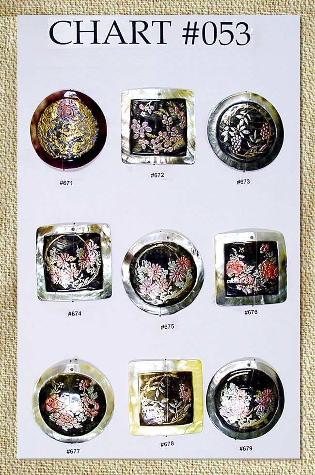 Assorted hand painted shell pendants.